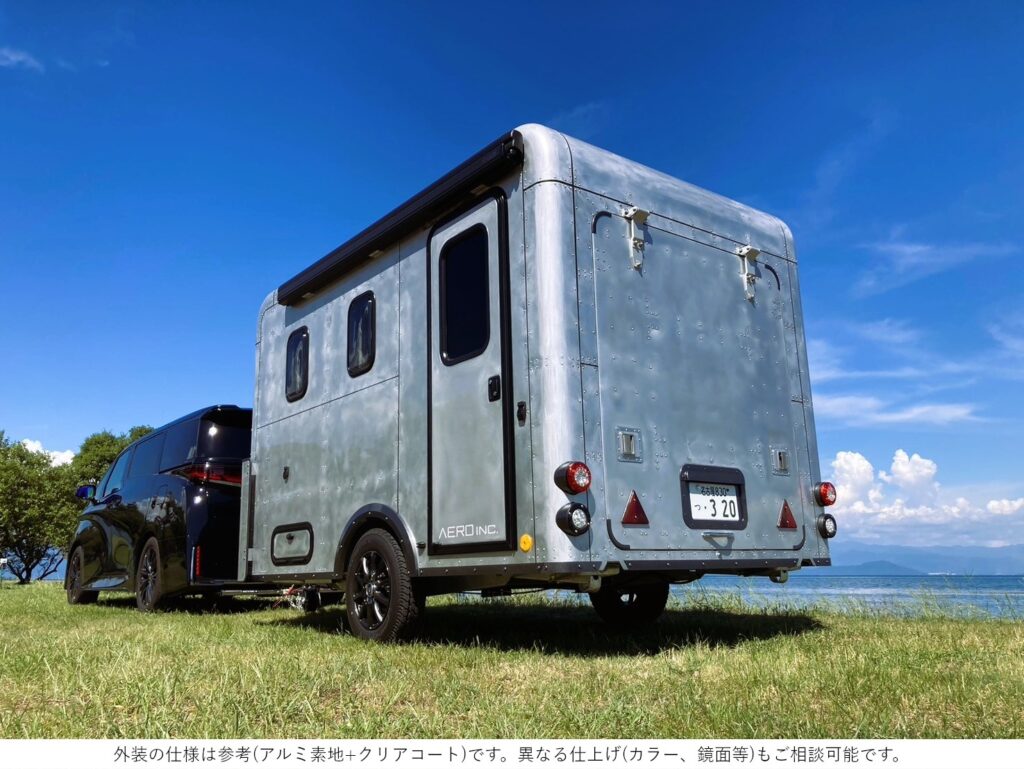 アルミ製のフレーム・外装が特徴的な、エアロからデビューした牽引免許不要のトレーラー1stモデル! 某旅客機をイメージしたデザインの3連窓を左右に備え、簡易的な屋根としても使える、上に大きく開くバックドアが特徴的。 気分はまるでファーストクラスの様な、広々とした室内空間は快適な時間を提供します。